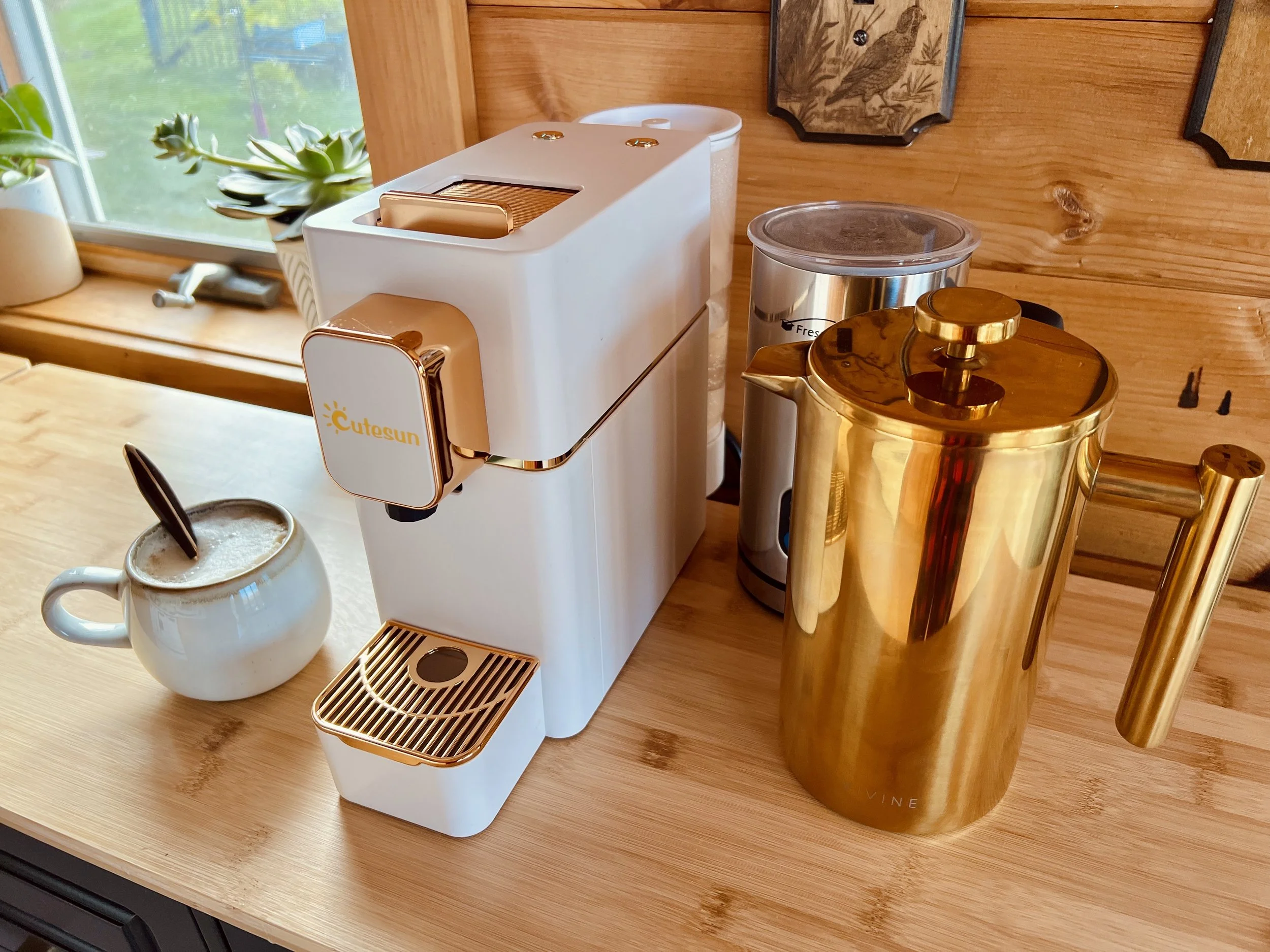 ESPRESSO MAKER: Water carafe is located at back, add water as needed. Capsules are in drawer below. Place coffee cup in front. Slide gold door back and add capsule. Hit either cup icon-they will flash. When they are done flashing hit the large or small cup icon.